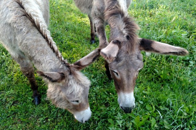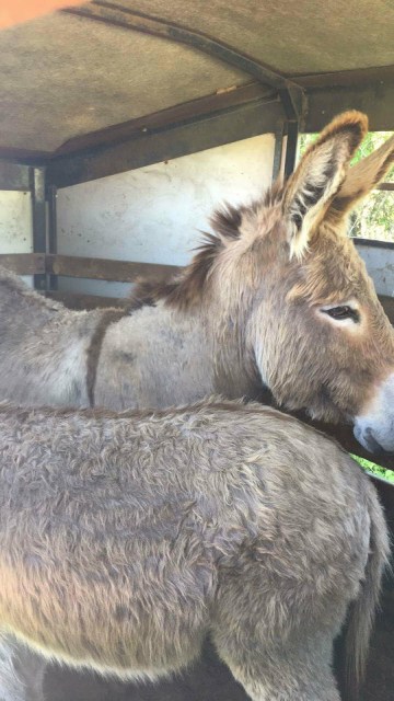 In our meetings and planning sessions the concern about coyotes had been raised more than once. Regionally, ranchers keep donkeys as a protector in the field against coyotes and they swear by them. So when Ned came across a Facebook ad for a donkey and her female foal for a shockingly reasonable price, we jumped on it. Turns out the owner’s horses had been terrorizing the donkeys. Out of care for the donkeys she had decided to sell as quickly as possible. Ned sent across a screenshot of the ad and we all said, “YES!” So now, we are the proud owners of two donkeys, who have been dubbed Maybelle and Hattie. After not hearing from him for a little bit, we asked if he was too late. His response was this pic from inside our trailer.